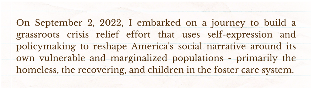 to reach the unreachable, protect those neglected, and to spread the truth of the Gospel in love and joy to undervalued segments of America’s social sector (foster care, homelessness relief, rehousing, recovery, and more).